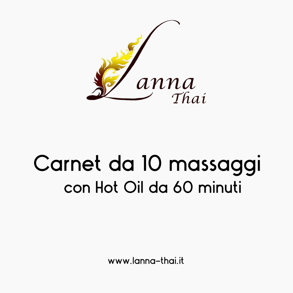 Comodo carnet da 10 massaggi con Hot Oil da 60 minuti, da utilizzare quando si preferisce presso il nostro centro Lanna Thai. Attenzione: non è possibile dividere una sessione di massaggio in due massaggi differenti.